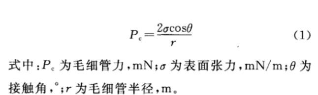 式中:Pc為毛細(xì)管力,mN;σ為表面張力,mN/m;θ為接觸角,°;r為毛細(xì)管半徑,m。