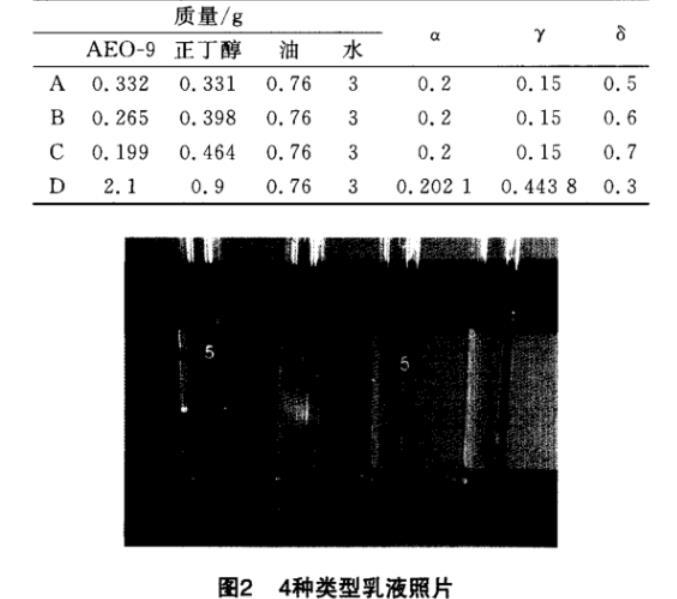 由圖1可見,在所配制的乳液中,既有均相乳液,也有兩相(上相、下相)乳液,同時有三相(中相)乳液。在選擇典型體系時,應體現(xiàn)出全面性,即以上4種類型乳液都涉及到,同時應考慮到漸變性,即固定某個變量(此處固定γ),一種相態(tài)向另一種相態(tài)轉變。由此,選出其中4組:A(下相乳液)、B(中相乳液)、C(上相乳液)、D(均相乳液),A、B、C、D的組成如表1所示,形成的乳液照片如圖2所示。分別將乳液部分分離出來,稀釋成質量分數(shù)為0.1%、0.3%、0.5%、1.0%的微乳液。