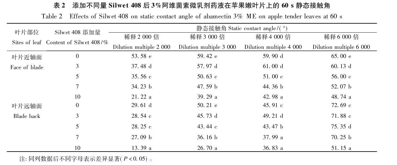 本研究表明,3%阿維菌素微乳劑中添加Silwet 408可顯著降低藥液表面張力及其在蘋果葉片上的接觸角,且表面張力和接觸角的變化與助劑添加量和葉片的狀態(tài)相關(guān)。因此在實際生產(chǎn)中,應(yīng)根據(jù)害蟲為害的部位及葉片狀態(tài)等,有針對性地選擇適宜的表面活性劑及其添加量。