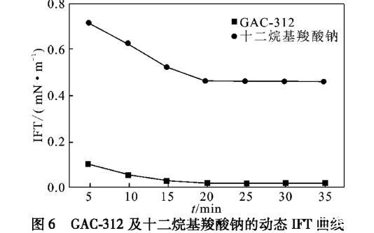 45℃時(shí),質(zhì)量濃度為0.5%的GAC-312及十二烷基羧酸鈉與原油間的動(dòng)態(tài)油水界面張力見圖6。