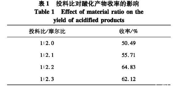 2.2.1N,N-丙二胺二乙酸鈉的合成條件優(yōu)化N,N-丙二胺二乙酸鈉的合成反應(yīng)中,不同反應(yīng)條件會(huì)生成不同的丙二胺取代產(chǎn)物;為了得到目標(biāo)產(chǎn)物N,N-丙二胺二乙酸鈉,同時(shí)減少其它副取代產(chǎn)物,采用單因素分析法研究了丙二胺和氯乙酸鈉的投料比對目標(biāo)產(chǎn)物丙二胺二乙酸鈉收率的影響。由于丙二胺二乙酸鈉溶解在混合溶劑中無法提取,因此采用酸化處理的辦法得到其酸化物N,N-丙二胺二乙酸,通過對比中間體酸化物的收率來確定合成目標(biāo)中間體所需的最佳投料比(摩爾比),結(jié)果見表1。