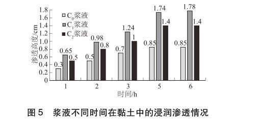 從圖5的試驗(yàn)結(jié)果可知:3種漿液在開始滲透后的3h內(nèi)浸潤滲透速度相對(duì)較快,3~5h之間,浸潤滲透速度相對(duì)變慢,5h后浸潤滲透高度趨于穩(wěn)定。在相同時(shí)間內(nèi),漿液在黏土中的浸潤滲透高度C1>C2>C0。滲透穩(wěn)定后,C1、C2漿液在黏土中的浸潤滲透高度比C0漿液的浸潤滲透高度分別提高了109.4%和64.7%,說明表面活性劑可以提高漿液的滲透性,且表面活性劑S1提高漿液滲透性的幅度更大。