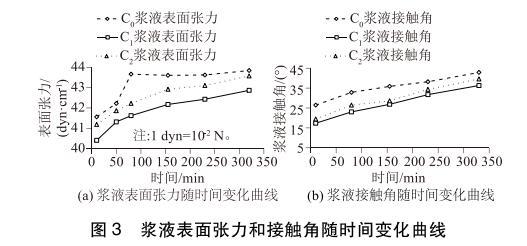 將配制好的C0、C1、C2 3種漿液每隔一定時(shí)間取樣進(jìn)行表面張力和接觸角的測(cè)試。測(cè)得表面張力隨時(shí)間變化曲線見圖3(a),接觸角隨時(shí)間變化曲線見圖3(b)。