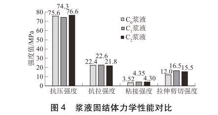 3種漿液固結(jié)體力學(xué)性能對(duì)比見圖4。由圖4可以看出:3種漿液固結(jié)體抗壓強(qiáng)度和抗拉強(qiáng)度數(shù)值差別不大,說明表面活性劑對(duì)漿液固結(jié)體的抗壓強(qiáng)度和抗拉強(qiáng)度無影響。但C1、C2漿液的粘接強(qiáng)度和拉伸剪切強(qiáng)度明顯高于C0漿液的粘接強(qiáng)度和拉伸剪切強(qiáng)度。其中C1漿液的粘接強(qiáng)度和拉伸剪切強(qiáng)度比C0漿液分別提高了23.6%和37.5%;C2漿液的粘接強(qiáng)度和拉伸剪切強(qiáng)度比C0漿液分別提高了22.2%和29.2%。其原因在于表面活性劑的加入降低了漿液的接觸角,使?jié){液有更好的浸潤性和潤濕性,從而提高了漿液的粘接強(qiáng)度和拉伸剪切強(qiáng)度。