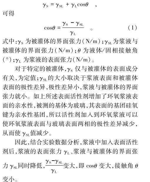 對(duì)于特定的被灌體,γS僅與被灌體的表面成分有關(guān),為定值;γSL的大小取決于漿液表面和被灌體表面的極性差異,極性差異小,漿液與被灌體的界面張力就小。如上所述表面活性劑增加了環(huán)氧漿液表面的親水性,被測(cè)的基體為玻璃,其表面的基團(tuán)硅氧鍵為親水性基團(tuán),所以活性劑加入到環(huán)氧漿液可以使環(huán)氧漿液表面與玻璃表面兩相的極性差異減少,從而使γSL值減少。
