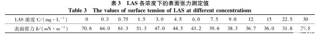 LAS是應(yīng)用最廣泛的陰離子表面活性劑,是我國合成洗滌劑活性物的主要構(gòu)成,可用作洗衣粉、香波、金屬清洗劑、脫墨劑等產(chǎn)品的原料,分析其生物降解性能十分必要。LAS試樣在不同濃度時測定的表面張力結(jié)果見表3。