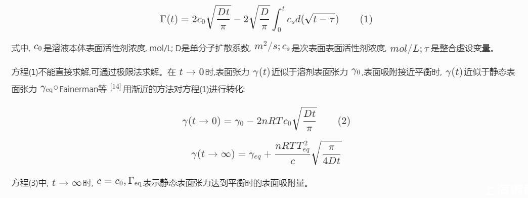 表面活性劑是一種能夠在界面吸附,降低界面張力的物質(zhì)。在界面快速形成過程中,如紡織品、紙和其他基質(zhì)的快速潤濕,液體的發(fā)泡,用靜態(tài)(平衡)表面張力不能全面表征表面活性劑快速降低界面張力的能力,而動態(tài)表面張力能更好地表征表面活性劑在上述過程中所起的作用。1946年Word和Tordai研究陰離子表面活性劑的界面吸附行為,提出了描述氣/液界面吸附量隨吸附時間變化的Word-Tordai方程;隨著各種檢測手段的開發(fā)應(yīng)用,20世紀90年代起,關(guān)于表面活性劑的動態(tài)表面張力及其在氣/液界面吸附行為又引起該領(lǐng)域研究者的關(guān)注。Eastoe和Dalton通過研究雙子型非離子表面活性劑在空氣——水界面的吸附機理,驗證了Word和Tordai提出的擴散控制吸附和混合動力控制吸附模型適用于該體系。柴金玲等利用Word-Tordai方程得到烷基聚葡糖苷(APG)在不同濃度、溫度時的擴散系數(shù)和表觀擴散系數(shù),并發(fā)現(xiàn)鹽對吸附行為有明顯影響;劉杰等通過Rosen模型研究膠束對APG的動態(tài)表面張力的影響,發(fā)現(xiàn)各項參數(shù)的變化趨勢不會因為膠束的形成而受到影響。
