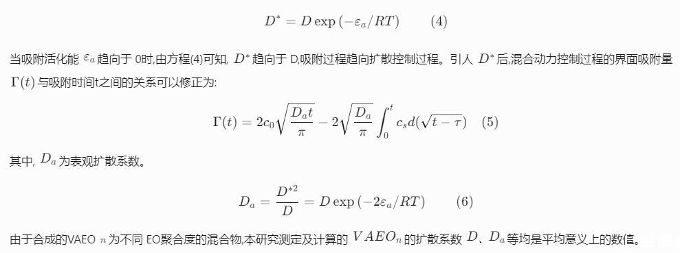 擴散控制的吸附過程,表面活性劑分子由濃度差驅(qū)使進入新表面,不存在吸附勢壘。Word-Tordai方程描述了界面吸附量Г(t)與吸附時間t的關(guān)系:Г(t)=2c0Dtπ-2Dπ∫t0csd(t-τ)(1)式中,c0是溶液本體表面活性劑濃度,mol/L,D是單分子擴散系數(shù),m2/s,cs是次表面表面活性劑濃度,mol/L,τ是整合虛設(shè)變量。方程(1)不能直接求解,可通過極限法求解。在t→0時,表面張力γ(t)近似于溶劑表面張力γ0,表面吸附接近平衡時,γ(t)近似于靜態(tài)表面張力γeq.Fainerman等用漸近的方法對方程(1)進行轉(zhuǎn)化:γ(t→0)=γ0-2nRTc0Dtπ(2)γ(t→∞)=γeq+nRTГ2eqcπ4Dt(3)方程(3)中,t→∞時,c=c0,Γeq表示靜態(tài)表面張力達到平衡時的表面吸附量。混合動力擴散吸附是指表面活性劑分子從本體擴散到次表面仍然遵循擴散機理,但從次表面層擴散到表面層時需克服一定的勢壘。Liggieri和Ravera[15,16]提出,次表面層中的分子,只有能量大于吸附活化能εa才能被吸附到表面,已吸附的分子,只有能量大于解吸活化能εb才能被解吸。以Word-Tordai方程為基礎(chǔ),引入矯正擴散系數(shù)D?。矯正擴散系數(shù)D?和擴散系數(shù)D關(guān)系定義為:D?=Dexp(——εa/RT)(4)當吸附活化能εa趨向于0時,由方程(4)可知,D?趨向于D,吸附過程趨向擴散控制過程。引入D?后,混合動力控制過程的界面吸附量Г(t)與吸附時間t之間的關(guān)系可以修正為:Г(t)=2c0Datπ-2Daπ∫t0csd(t-τ)(5)其中,Da為表觀擴散系數(shù)。Da=D?2D=Dexp(——2εa/RT)(6)由于合成的VAEOn為不同EO聚合度的混合物,本研究測定及計算的VAEOn的擴散系數(shù)D、Da等均是平均意義上的數(shù)值。