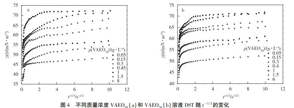 經(jīng)計算得,(dγ/dt-1/2)cmc/(dγ/dt-1)c>cmc與溶液質(zhì)量濃度成負(fù)相關(guān),從方程(7)可知膠束壽命與質(zhì)量濃度成正相關(guān),即在有膠束存在的溶液中,質(zhì)量濃度越高,τ2越長。可以通過比較DST達(dá)到平衡的時間與τ2的長短得出膠束中表面活性劑分子是否參與界面吸附,從而確定其是否影響吸附行為。本實驗中質(zhì)量濃度大于cmc的溶液,達(dá)到吸附平衡的時間最長為0.25s(t-1/2=2s-1/2,見圖4)。膠束最短壽命時間來自VAEO10,圖5顯示VAEO10的(dγ/dt-1/2)cmc/(dγ/dt-1)c≈cmc=0.83s1/2,代入方程(7)計算得τ2=1.14s,大于0.25s,表明膠束對VAEO10和VAEO20的吸附機(jī)理影響較小。因此,質(zhì)量濃度大于cmc的VAEO溶液在吸附前期和后期的吸附模型都屬于混合動力控制吸附。