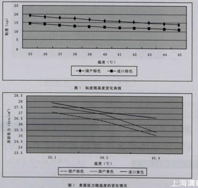 3)進口陶瓷墨水與國產(chǎn)陶瓷墨水相比,內(nèi)在的性能參數(shù)(表面張力、粘度、容重)隨溫度變化的規(guī)律一致。