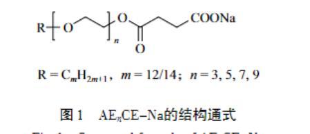 表面活性劑是一類應(yīng)用廣泛的有機(jī)化合物,極少的用量就能顯著提高溶液的性能,因此,表面活性劑的研究具有重要的現(xiàn)實(shí)和理論意義。其中,陰離子和非離子型表面活性劑的用量最多且應(yīng)用最為廣泛,它們具有優(yōu)異的去污性、水溶性、耐熱性、耐鹽性及制備成本低和環(huán)境友好等優(yōu)點(diǎn)。然而,傳統(tǒng)的表面活性劑分子通常只包含一個(gè)親水頭基和一個(gè)疏水尾鏈,很難同時(shí)具有陰離子和非離子表面活性劑的特性。值得一提的是,脂肪醇醚琥珀酸酯鹽(AEnCE-Na,n=3,5,7,9)是一種新型的表面活性劑,結(jié)構(gòu)通式如圖1所示。結(jié)構(gòu)決定性質(zhì),因此,可以推斷AEnCE-Na具有許多優(yōu)異的性能:1)一個(gè)分子中同時(shí)存在兩個(gè)親水基團(tuán)(EO鏈和陰離子頭基)和一個(gè)疏水基團(tuán)(烷基碳鏈),使其具有優(yōu)異的表面活性、乳化性和發(fā)泡性;2)分子中的酯基在水解后可形成具有優(yōu)異生物降解性的非離子表面活性劑和鹽,因此,該類表面活性劑安全且環(huán)保,符合當(dāng)代“綠色化”的發(fā)展理念;3)直鏈表面活性劑比支鏈表面活性劑具有更好的自降解能力。然而,目前對(duì)于脂肪醇醚琥珀酸酯鹽表面活性劑的研究甚少。
