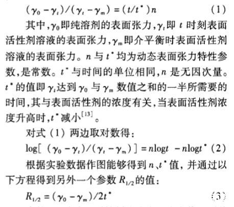 其中,即純?nèi)軇┑谋砻鎻埩Γ磘時(shí)刻表面活性劑溶液的表面張力,即介平衡時(shí)表面活性劑溶液的表面張力。n與t均為動(dòng)態(tài)表面張力特性參數(shù),是常數(shù)。t與時(shí)間的單位相同,n是無因次量。t的值即達(dá)到。與7數(shù)值之和的一半所需要的時(shí)間,其與表面活性劑的濃度有關(guān),當(dāng)表面活性劑濃度升高時(shí),t減小。