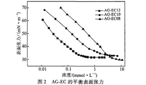 以去離子水為溶劑配制不同濃度的AG.EC溶液,靜置12 h后利用krussK12表面張力儀通過wilhelmy吊片法測(cè)定其平衡表面張力。控制溶液溫度(254-0.3)clC,測(cè)定前去離子水校準(zhǔn)表面張力儀至(72±0.3)mN/m。由表面張力()一濃度對(duì)數(shù)(1gc)圖,可得AG.EC在水中的臨界膠束濃度(cmc)以及cmc下的表面張力(一)。