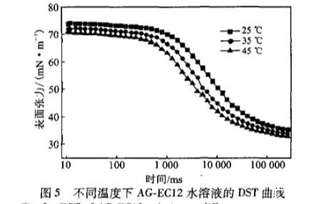 由圖5可知,當溫度升高,DST下降的速率明顯加快。這是因為分子的不規(guī)則運動更加激烈,使得分子間的引力減小。表面張力越早開始下降,在各個階段的表面張力值就越低。在45℃下開始測量時,表面張力已經(jīng)降到了70mN/m左右,這也許是由于溫度升高降低了純?nèi)軇┧谋砻鎻埩ΑI邷囟龋砻鎻埩ο陆档母欤走_到第四個階段平衡狀態(tài)。這說明了高溫下其動態(tài)表面活性更好。可能是由于表面活化能在高溫時更低,使得AG.EC分子更易在溶液表面吸附。