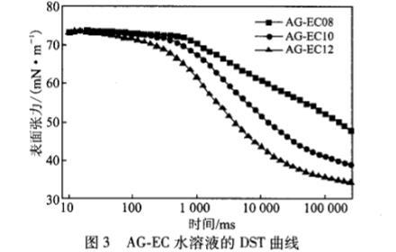 由圖3可知,對于不同鏈長的AG.EC水溶液,其DST曲線都是微微下降一快速下降一緩慢平衡的過程。另外在疏水鏈變長的同時,DST曲線的誘導(dǎo)期時間縮短,DST下降趨勢增加,介平衡狀態(tài)表面張力值越低。這是由于疏水烷基鏈增長使得表面活性劑的疏水性增強,更容易吸附到溶液的表面。
