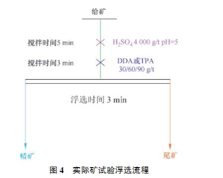 在XFG掛槽浮選機(jī)上進(jìn)行實(shí)際礦浮選試驗(yàn),轉(zhuǎn)速設(shè)為1 992 r/min。每次稱取250.0 g礦樣放入0.5 L浮選槽中,加入0.3 L自來水;綜合考量文獻(xiàn)調(diào)研、純礦物浮選結(jié)果、經(jīng)濟(jì)性等方面因素,確定礦漿pH值等于5為較佳的浮選pH條件。使用H?SO?作為pH調(diào)整劑,調(diào)節(jié)礦漿pH值為5,攪拌礦漿5 min后,加入一定量的DDA或TPA,攪拌3 min后開始用刮板刮出泡沫產(chǎn)品,每間隔3 s刮1次,浮選刮泡時間為3 min。結(jié)束后將得到的泡沫產(chǎn)品和槽內(nèi)產(chǎn)品分別烘干、稱量,測定品位,并計(jì)算產(chǎn)率與回收率。實(shí)際礦浮選試驗(yàn)流程如圖4所示。