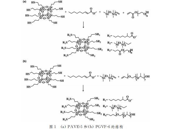 在已經(jīng)加入25mL二氯甲烷溶劑的50mL圓底燒瓶中加入定量組分的APEG400、VDMS和FEMA,進(jìn)行混合溶解,最后加入1%(質(zhì)量分?jǐn)?shù))的光引發(fā)劑溶解完全后進(jìn)行封口處理,于溫度為30℃、攪拌速度為300r/min的條件下,放置于紫外燈(20W)照射45min,反應(yīng)結(jié)束后,旋蒸除去溶劑,最終得到無色透明、流動(dòng)性明顯且富有粘稠狀態(tài)的液體產(chǎn)物POSS-APEG4001-VDMS2-FEMA5,簡(jiǎn)稱為PAVE-5。同樣的方法改變其中之一的單體為APEG750,合成得到POSS-APEG7501-VDMS1-FEMA,簡(jiǎn)稱PGVF-6。