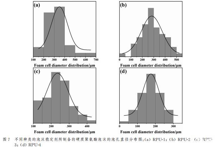 為了對(duì)聚氨酯泡沫孔徑大小和分布情況進(jìn)行量化,通過ImageJ軟件對(duì)SEM測試結(jié)果進(jìn)行處理分析,其孔徑分布直方圖如圖7所示。通過泡沫的孔徑分布直方圖對(duì)比結(jié)果可以看出,添加國產(chǎn)-1的聚氨酯泡沫孔徑分布范圍在100~700μm,存在較大直徑的泡孔,添加進(jìn)口-2的聚氨酯泡沫泡孔直徑分布范圍在0~550μm,雖然分布范圍有變窄,但也存在較大泡孔直徑,添加PAVE-5的聚氨酯泡沫泡孔直徑分布范圍在100~450μm,泡孔分布范圍減小,但仍然存在超過400μm的大泡孔,分布范圍最窄的是添加PGVF-6泡沫穩(wěn)定劑的硬質(zhì)聚氨酯泡沫,分布范圍在0~300μm,沒有超過400μm直徑的泡孔,泡沫泡孔直徑得以減小,泡沫泡孔細(xì)小均勻。這種微觀結(jié)構(gòu)上的改善可能得益于在發(fā)泡過程中,接枝APEG的POSS可以作為三維網(wǎng)絡(luò)結(jié)構(gòu)的交聯(lián)點(diǎn),通過其與聚氨酯基體的相容性,親水性-OH基團(tuán)有助于形成更加穩(wěn)定的泡沫結(jié)構(gòu)。