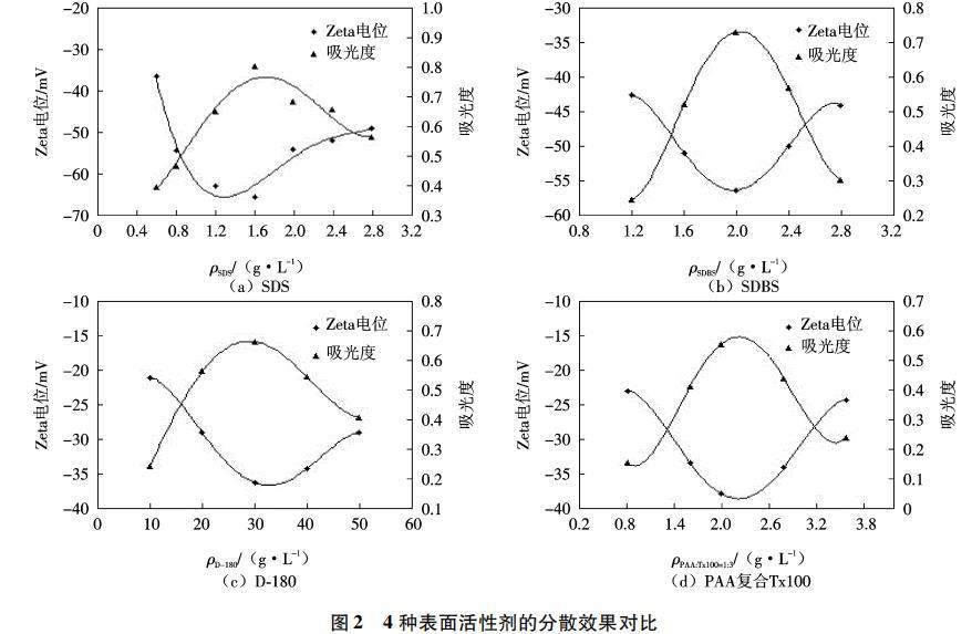 圖2為pH=7的條件下,CNFs(質(zhì)量濃度0.05g/L)懸浮液的Zeta電位及吸光度隨表面活性劑濃度的變化情況.由于4種表面活性劑中,SDS與SDBS均為陰離子型表面活性劑,D-180、PAA和Tx100雖為高分子聚合物,但在分散過(guò)程中均可電離出陰離子,故懸浮液中CNFs表面的Zeta電位均為負(fù)值.從Zeta電位曲線來(lái)看,4種懸浮液的Zeta電位絕對(duì)值均隨表面活性劑濃度的增加而呈現(xiàn)先增大后減小的趨勢(shì),期間出現(xiàn)明顯峰值.從吸光度曲線來(lái)看,4種懸浮液的吸光度曲線也隨表面活性劑濃度的增加而先增大后減小,同樣存在明顯的峰值.綜合分析2條曲線可以得出4種表面活性劑的最佳分散濃度:SDS的最佳分散濃度為1.6~g/L,SDBS的最佳分散濃度為2.0~g/L,D-180的最佳分散濃度為30 g/L,PAA復(fù)合Tx 100的最佳分散濃度為2.0~g/L.通過(guò)橫向?qū)Ρ?幅曲線圖,可以比較4種表面活性劑在各自最佳分散濃度下對(duì)CNFs的分散效果.SDS在最佳分散濃度下得到的CNFs懸浮液Zeta電位絕對(duì)值達(dá)到60 mV,吸光度達(dá)到0.80,均高于其他3種表面活性劑,說(shuō)明SDS的分散性能最好,形成的CNFs懸浮液穩(wěn)定性最高.SDBS的分散效果次之,在最佳分散濃度下,CNFs懸浮液的Zeta電位絕對(duì)值為56 mV,吸光度達(dá)到0.75.再次是D-180,在其最佳濃度下,懸浮液的Zeta電位絕對(duì)值為37 mV,吸光度為0.67.分散效果最差的為PAA復(fù)合Tx100,所得的CNFs懸浮液的Zeta電位絕對(duì)值為38mV,吸光度僅為0.55.