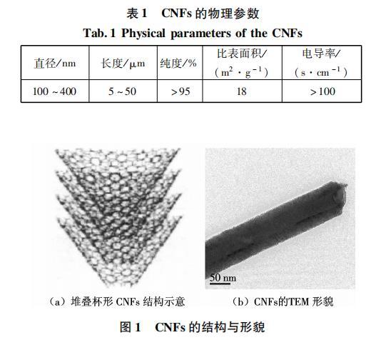 納米碳纖維(carbon nanofibers,CNFs)是近十年興起的一種新型亞微米增強(qiáng)纖維材料,它是化學(xué)氣相生長(zhǎng)碳纖維的一種形式,一般通過(guò)裂解氣相碳?xì)浠衔镏苽洌菢?gòu)成以碳黑、富勒烯、單壁和多壁碳納米管為一端,以連續(xù)碳纖維為另一端鏈節(jié)中的一環(huán).CNFs的直徑一般在150~400nm之間,與碳納米管(CNTs)相比,CNFs的制備更易于實(shí)現(xiàn)工業(yè)化生產(chǎn).CNFs有著優(yōu)異的物理性能、力學(xué)性能和化學(xué)性能.研究表明,CNFs的抗拉強(qiáng)度可以達(dá)到2~5 GPa,平均彈性模量為300 GPa.除具有普通氣相生長(zhǎng)碳纖維的特性,如低密度、高比模量、高比強(qiáng)度、高導(dǎo)電性等性能外,CNFs還具有缺陷數(shù)量少、比表面積大、結(jié)構(gòu)致密等優(yōu)點(diǎn),這使得CNFs在納米復(fù)合材料領(lǐng)域得到了廣泛的應(yīng)用.然而,納米復(fù)合材料的性能往往會(huì)受到兩個(gè)主要因素的影響,一個(gè)是納米材料在基體材料中的分散程度,另一個(gè)是納米材料表面與基體材料之間的黏結(jié)強(qiáng)度和能量.由于受到范德華力的的影響,CNFs彼此吸引并相互纏結(jié)在一起,懸浮于水的表面,幾乎無(wú)法均勻溶解,這大大制約了CNFs在復(fù)合材料中的應(yīng)用.如何解決CNFs在水性體系中的分散已成為研究者廣泛關(guān)注的熱點(diǎn).
