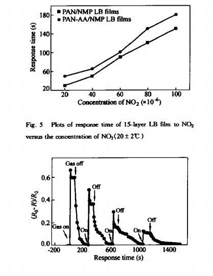 在敏感特性的測試過程中,我們發(fā)現(xiàn)純聚苯胺LB膜對NO?具有較好的敏感性。聚苯胺LB膜的敏感性及響應時間與LB膜的層數(shù)有密切關(guān)系。隨層數(shù)的增加,對NO?的響應時間逐漸增長,這可以從圖4中看出。