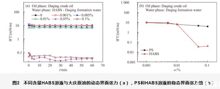 圖2不同含量HABS溶液與大慶原油的動(dòng)態(tài)界面張力(a),PS和HABS溶液的穩(wěn)態(tài)界面張力值(b)