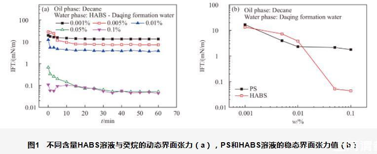 圖1不同含量HABS溶液與癸烷的動(dòng)態(tài)界面張力(a),PS和HABS溶液的穩(wěn)態(tài)界面張力值(b)