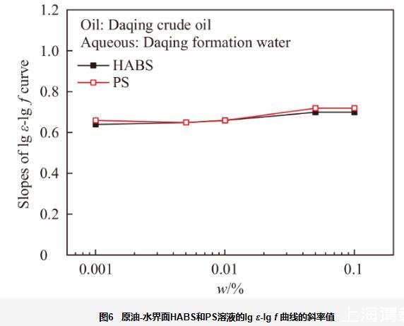 圖6為PS和HABS在原油-水界面的lgε-lg f曲線的斜率。在原油-水界面,HABS的斜率與PS的斜率幾乎相同,都約為0.7。這與圖4中正癸烷-水界面的兩種表面活性劑的曲線斜率明顯不同。PS在原油-水界面的斜率值比在正癸烷-水界面的斜率值高,而HABS在原油-水界面的斜率值比在正癸烷-水界面的斜率值低。這是由于大慶原油的活性組分在界面上混合吸附,對界面膜的黏彈特性也有貢獻。大慶原油屬于輕質(zhì)原油,原油組分中小分子量的石油酸組分較多,尺寸較大的瀝青質(zhì)較少。小分子量原油活性組分在界面上的吸附,一方面降低了分子尺寸較小的HABS體系的黏性,一方面增大了分子尺寸較大的PS體系的黏性。因此,在原油-水界面,HABS和PS體系lgε-lg f曲線的斜率相差不大。