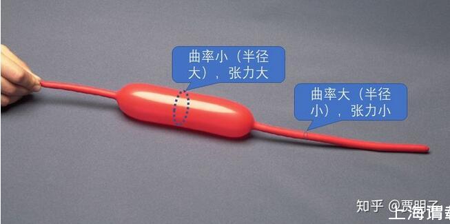 氣球內部的氣體壓力處處相等,但是,接觸過這種氣球的人都有一個經驗,就是粗的地方繃得緊,而細的地方繃得就不那么緊。如上圖所示,繃得緊的地方和繃得松的地方,產生的壓力差是相等的,但是他們的曲率是不相等的:曲率越大,同樣的張力所能產生的壓力差就更大。