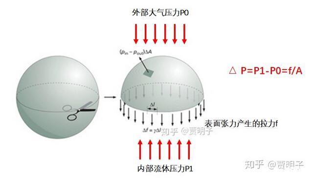 而這里有一件非常關鍵的事請,就是由于表面張力的存在,彎曲的表面就會在兩側形成壓力差。就好像緊繃的氣球,其內部壓力要高于外部的壓力。這種壓力差來自哪里?當然就是氣球皮膜緊繃的張力。由于氣球的彎曲表面,使得其張力最終表現(xiàn)為內部壓力的升高。