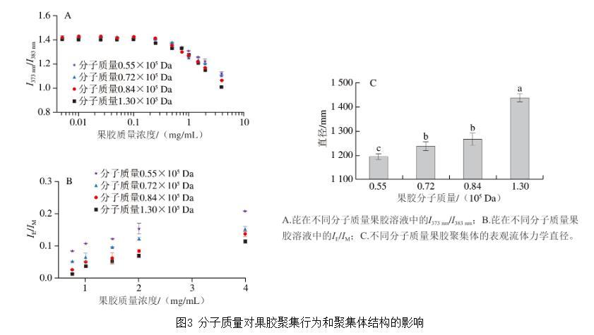 為研究分子質(zhì)量對果膠聚集行為的影響,本實驗分析了芘在不同分子質(zhì)量果膠溶液中的I373 nm/I383 nm。如圖3A所示,在4種不同分子質(zhì)量的果膠溶液中,芘的I373 nm/I383 nm均在果膠質(zhì)量濃度達到特定值后開始降低,表明這些果膠均可在溶液中組裝形成包含疏水微區(qū)的聚集體。分子質(zhì)量為0.55×105、0.72×105、0.84×105 Da和1.30×105 Da果膠的臨界聚集質(zhì)量濃度分別為0.52、0.50、0.45 mg/mL和0.36 mg/mL。此外,在高于臨界聚集濃度的條件下,高分子質(zhì)量果膠呈現(xiàn)出更低的I373 nm/I383 nm。這些結(jié)果表明高分子質(zhì)量果膠更易發(fā)生聚集,且形成的聚集體內(nèi)部疏水微區(qū)的極性更低。