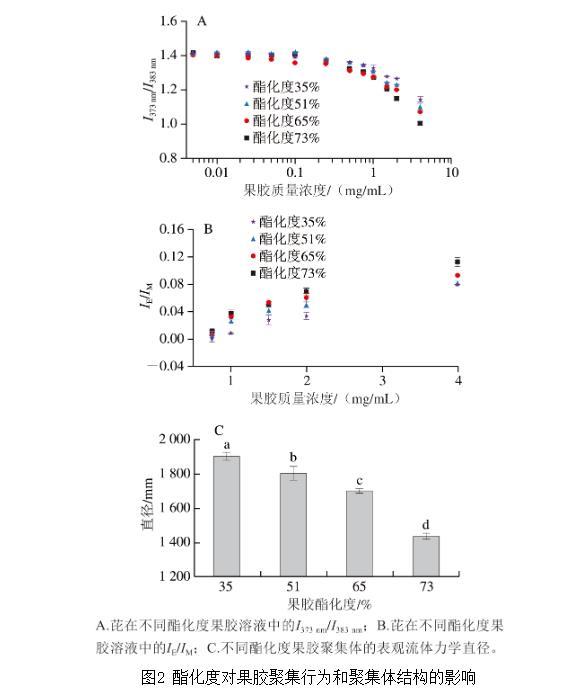 如圖2B所示,芘在高酯化度果膠溶液中表現(xiàn)出更高的IE/IM。這可能是因為高酯化度果膠形成的聚集體內(nèi)部具有更多且極性更低的疏水微區(qū),促進了芘分子在疏水微區(qū)中的溶解和分布,進而增加了芘二聚體的形成,最終導(dǎo)致IE/IM升高。這一結(jié)果進一步驗證了高酯化度果膠形成的聚集體更疏水的結(jié)論。