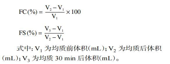 式中:V1為均質(zhì)前體積(mL);V2為均質(zhì)后體積(mL);V3為均質(zhì)30 min后體積(mL)。