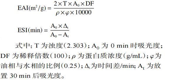 蛋清蛋白的乳化活性指數(shù)(emulsifying ability index,EAI)和乳化穩(wěn)定性(emulsifying stability index,ESI)測定。制備不同pH(2.0、4.0、6.0、8.0、10.0)含1%(w/v)蛋清蛋白的溶液,取15 mL溶液與5 mL玉米油混合,在10000 r/min條件下高速均質(zhì)1 min。分別在0、30 min時從離心管底部取50μL溶液,加入到4950μL 0.1%SDS溶液中,渦旋5 s混勻,立即在500 nm波長處測定吸光度。