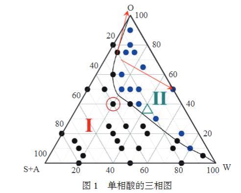通過擬三元相圖制備單相酸相圖,根據(jù)油相(O)、酸相(W)、表面活性劑(S)+助表面活性劑(A)的比例進(jìn)行三相圖的繪制。室溫下,固定油相(O)的加量,固定非離子表面活性劑(S1)與陽離子表面活性劑(S2)的質(zhì)量比,固定表面活性劑(S,S=S1+S2)與助表面活性劑(A)的質(zhì)量比。將不同比例下的液體進(jìn)行離心,然后進(jìn)行觀測(cè),觀察體系由澄清透明(一相)變?yōu)榛鞚幔ǘ啵┑南嘧冞^程,在每次發(fā)生相變的同時(shí)記錄所滴加鹽酸的量,以O(shè)、S+A、W為三相,繪制擬三元相圖,見圖1。由圖1可知,在圖1的紅圈標(biāo)記區(qū)域,配方的經(jīng)濟(jì)性最好,是維持單相區(qū)域最小的表面活性劑用量(S+A),且該配方下的單相酸遇水遇油后仍可在較大范圍內(nèi)保持單相。