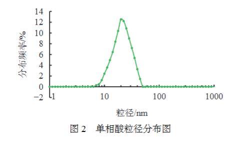 采用激光粒度分析儀對(duì)單相酸粒徑及分布進(jìn)行了測(cè)定,實(shí)驗(yàn)結(jié)果見圖2。可知單相酸粒徑大小分布在7~50 nm范圍之內(nèi),分布較窄,為高斯分布,在單相微乳粒徑范圍內(nèi)。