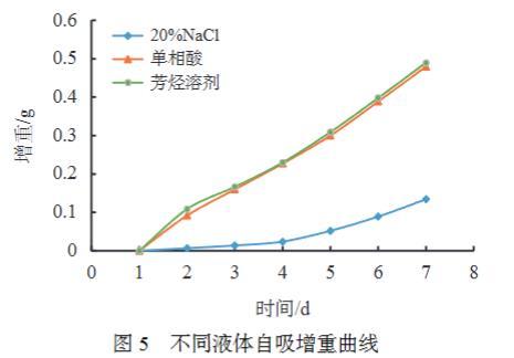 設(shè)置不同液體進(jìn)行自吸實(shí)驗(yàn),對(duì)比親油巖心對(duì)于不同液體的自吸能力,實(shí)驗(yàn)結(jié)果見圖5。對(duì)孔隙介質(zhì)而言,潤濕性控制兩相或多相流體的分布和流動(dòng)。平衡時(shí)濕潤相與孔隙表面相互接觸,而非濕相占據(jù)孔隙的中央位置,介質(zhì)中發(fā)生兩相或多相流動(dòng)時(shí),毛管力與濕相流動(dòng)方向一致,是非濕相自發(fā)進(jìn)入巖心介質(zhì)驅(qū)替潤濕相的阻力,對(duì)于油濕巖心介質(zhì),很難發(fā)生水的自吸。從實(shí)驗(yàn)結(jié)果可以看出,單相酸自吸效果和芳烴溶劑十分接近。