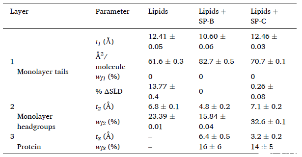 圖5、從35 mN/m處的擬合獲得的結(jié)構(gòu)參數(shù)分別表示每層的厚度和水體積分數(shù)。ΔSLD(%)表示擬合SLD與理論SLD值之間的百分比差。