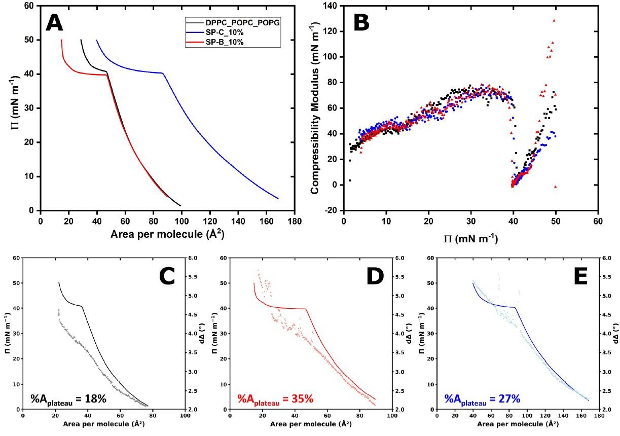 提出的結(jié)果清楚地證明了蛋白質(zhì)SP-B在壓縮下成核和穩(wěn)定3D界面多層儲層的關(guān)鍵作用,而SP-C的作用似乎是輔助的——促進脂質(zhì)交換,但需要SP-B來結(jié)構(gòu)整合到界面結(jié)構(gòu)中。從表面循環(huán)前后的中子反射法的可比剖面推斷出,這些SP-B促進的儲層一旦受到類似呼吸的壓縮-膨脹動力學(xué),就會與界面穩(wěn)定地結(jié)合。然后SP-B被證實是維持肺泡空間PS薄膜復(fù)雜結(jié)構(gòu)的關(guān)鍵分子。本工作連接了早期的分子模擬和生理學(xué)研究,為SP-B獨特的界面重塑能力提供了直接的實驗證據(jù),這與之前關(guān)于SP-B對呼吸和生命至關(guān)重要的知識一致。未來結(jié)合氘代蛋白、生理脂質(zhì)混合物和全組合蛋白質(zhì)補體的工作將完善對PS動力學(xué)的理解,對設(shè)計新一代優(yōu)化的臨床PS制劑以治療尚未解決的表面活性劑缺乏性肺部疾病產(chǎn)生影響。