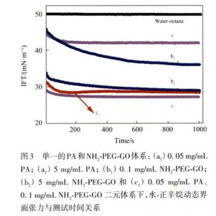 在25℃條件下,測得水和正辛烷之間的界面張力為50.7 mN/m(圖3),與之前研究中報道的界面張力值51.16 mN/m非常接近。為了研究PA與NH2-PEG-GO在共存時對界面張力的影響,分析了0.05 mg/mL PA、0.1 mg/mL NH2-PEG-GO各自對界面張力的影響。圖3顯示PA與NH2-PEG-GO均具有界面活性,能夠吸附到水-正辛烷界面上,降低界面張力。同時也觀察到:0.05 mg/mL PA降低界面張力速率快,平衡時間較短(<200 s),界面張力曲線呈現(xiàn)先快速下降后平衡的趨勢,而當(dāng)0.1 mg/mL NH2-PEG-GO存在于溶液中時,界面張力降低速率較慢,大約在700 s后達到平衡。分析發(fā)現(xiàn),界面張力隨著時間的演變呈現(xiàn)先快速下降,后緩慢下降,最后平衡的特點,這表明接近吸附平衡時出現(xiàn)勢壘,減緩了粒子在界面上的進一步吸附。這種吸附勢壘由多種因素導(dǎo)致,通常與已吸附在界面上的分子所產(chǎn)生的表面壓以及隨著界面密度提高,分子取向的改變相關(guān)。同時在吸附后期,可供吸附的界面面積減少,已經(jīng)吸附到界面上的粒子必須重新排列以空出足夠的空間供額外的粒子進行吸附。這種重排的速率是由粒子的面內(nèi)遷移率決定的,即粒子在界面上的擴散系數(shù)。該擴散系數(shù)通常要小于粒子在本體中的擴散系數(shù),并與粒子尺寸、粒子表面配體修飾等相關(guān)。