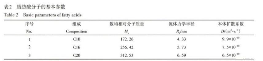 對(duì)比不同鏈長(zhǎng)脂肪酸在不同質(zhì)量濃度時(shí)的動(dòng)態(tài)界面張力(圖9A-9C),發(fā)現(xiàn)雖然脂肪酸在正辛烷中的擴(kuò)散系數(shù)隨著碳鏈的增長(zhǎng)而減小(表2),但添加高質(zhì)量濃度C20酸時(shí),界面張力值到達(dá)平衡的時(shí)間明顯縮短,這表明脂肪酸烷基鏈長(zhǎng)度會(huì)影響脂肪酸在界面的性質(zhì)。并且發(fā)現(xiàn)脂肪酸烷基鏈越長(zhǎng),與NH2-PEG-GO協(xié)同穩(wěn)定的水-正辛烷界面張力越低。并且隨著脂肪酸質(zhì)量濃度增加,烷基鏈鏈長(zhǎng)增加對(duì)界面張力降低效果越明顯(圖9D)。