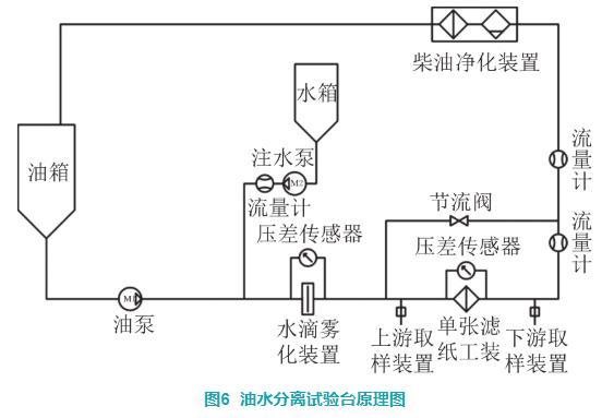 油水分離試驗(yàn)臺(tái)的原理如圖6所示。通過向水滴霧化裝置上游管路內(nèi)按質(zhì)量比0.15%的比例注水,油水混合物通過孔板裝置后柴油中的水會(huì)破散成更小的水滴,通過控制水滴霧化裝置兩端的壓差可以得到不同粒徑分布的水滴,調(diào)節(jié)壓差得到合適粒徑分布的水滴進(jìn)行油水分離效率試驗(yàn)。