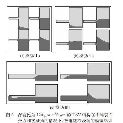 模型(I)使用的表面張力和接觸角為不含活性劑的TSV標(biāo)準(zhǔn)鍍液的實(shí)際測(cè)量值,仿真結(jié)果是不能完全浸潤;模型(II)采用的是在1L TSV標(biāo)準(zhǔn)鍍液中加入20mL活性劑溶液的實(shí)際測(cè)量值,這兩種模型在仿真中均表現(xiàn)為不能完全浸潤。
