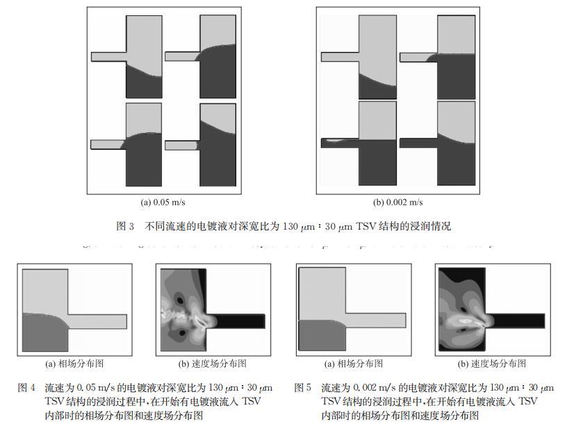 TSV深寬比設(shè)置為130μm:30μm,電鍍液流人速度為0.05 m/s和0.002 m/s的浸潤仿真結(jié)果分別如圖3所示,前者在TSV底部形成氣泡,后者可以完全浸潤。模擬結(jié)果表明降低電鍍液流入速度有利于浸潤。通過仿真中兩種情況下浸潤過程中的流速場(chǎng)對(duì)比,可以看出在電鍍液流入的過程中,電鍍液流人速度較大時(shí),如圖4(b)所示,電鍍液表面距離TSV較遠(yuǎn)的部分有著相對(duì)更大的流速,即電鍍液流過TSV上方的速度大于電鍍液向TSV內(nèi)部流入的速度,導(dǎo)致在電鍍液流過TSV上方時(shí),其流入TSV內(nèi)部的分流量還沒有充滿TSV內(nèi)部排出其中氣體之前,電鍍液就已經(jīng)流過了TSV上方,并將TSV口部封死,導(dǎo)致內(nèi)部殘留氣體無法排出,形成不完全浸潤;而當(dāng)電鍍液流入速度較小時(shí),如圖5(b)所示,電鍍液表面在TSV口部附近具有相對(duì)更大的流速,即電鍍液向TSV內(nèi)部流入的速度大于其流過TSV上方的速度,使得電鍍液流過TSV上方時(shí),有足夠的分流量流入TSV內(nèi)部,將其中氣體排出并將TSV填滿,實(shí)現(xiàn)完全的浸潤。