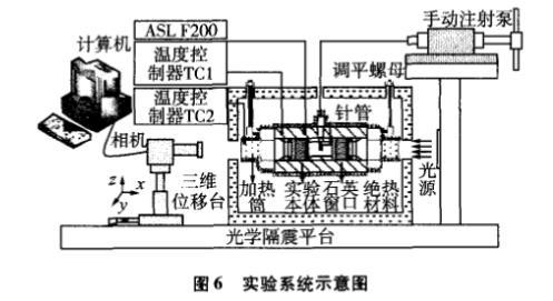實驗本體材料為316不銹鋼,設(shè)計承壓范圍為0—20MPa,兩端設(shè)計有法蘭結(jié)構(gòu)的觀察窗。懸滴通過不銹鋼針頭形成,其端口平整,外徑規(guī)格為(1.61±0.005)mm,內(nèi)徑為0.3mm,通過螺紋結(jié)構(gòu)緊固于本體內(nèi)。采用LED白色冷光源和1400萬像素的CMOS相機及其放大鏡頭采集懸滴圖像。實驗本體溫度采用電加熱分段控制,在其非觀察面上均勻纏繞電加熱絲并利用Fluke2100溫度控制器控制其溫度,在觀察窗兩側(cè)安裝有加熱筒,并控制加熱筒的溫度高于本體溫度約5—10℃,防止在升溫的過程中窗口結(jié)霧。實驗系統(tǒng)的溫度范圍為20—180℃,溫度波動度好于±10mK。本體溫度采用ASL F200高精度溫度測量儀測量,校準證書顯示的全量程測溫不確定度為±10mK,Pt100溫度計由北京計量院標定,標定證書顯示的不確定度為±5mK。因此,本文實驗系統(tǒng)的溫度擴展不確定度為±30mK(k=2)。實驗本體通過螺紋桿懸至于環(huán)氧樹脂保溫箱體內(nèi)部,并利用調(diào)平螺母調(diào)節(jié)本體的高度和水平,從而使其內(nèi)部的針管處于鉛垂位置并在相機視野的中心。待本體溫度穩(wěn)定30min后,開始采集懸滴圖像,每滴采集10次,間隔為3s,至少采集3個懸滴共計30張圖片,擬合計算并取平均值作為最后的實驗結(jié)果。
