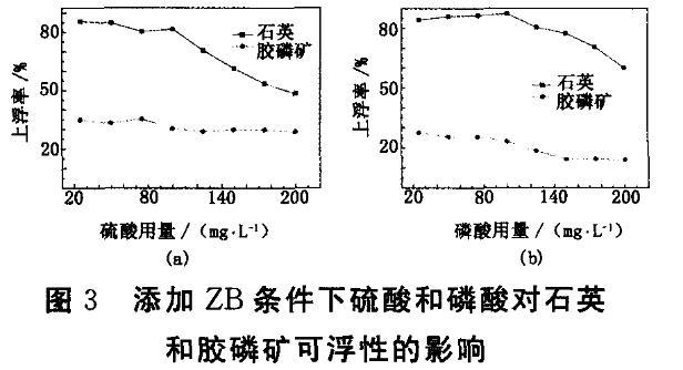 此外使用ZB和硫酸及ZB和磷酸組合的復(fù)配藥劑作為調(diào)整劑進(jìn)行試驗(yàn),控制ZB用量為150 mg/L,分別考察添加不同用量的硫酸和磷酸對(duì)石英和膠磷礦可浮性的影響,結(jié)果見(jiàn)圖3。