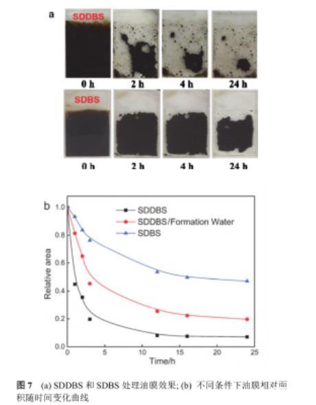 如圖7a所示,經(jīng)SDDBS溶液處理后,油膜面積降低明顯,油膜收縮最終以油珠形式從巖石表面脫離.而經(jīng)SDBS溶液處理后,油膜面積僅有少量減少,24 h后仍有大部分油膜未被有效剝離.油膜相對(duì)面積隨時(shí)間的變化曲線如圖7b所示,SDDBS處理后,24 h內(nèi)油膜面積減小了89%(黑色曲線).而油膜在SDBS中面積僅減小約53%(藍(lán)色曲線),說明羥基的引入有效促進(jìn)了油膜剝離.使用模擬地層水(配方見表S2,見支持信息)配置0.02%(w)SDDBS溶液,以相同方法進(jìn)行油膜剝離實(shí)驗(yàn),得到圖7b紅色曲線.由圖可得,地層水條件下SDDBS溶液的油膜剝離效果減弱,24 h內(nèi)油膜面積減小了81%,結(jié)合前述潤(rùn)濕性調(diào)控與界面張力結(jié)果,鹽濃度的增加雖然降低了油水界面張力,但同時(shí)使得處理后表面水下油滴接觸角減小,疏油性減弱,最終導(dǎo)致油膜剝離效果變差,說明油固界面潤(rùn)濕性調(diào)控在油膜剝離中起重要作用.較于文獻(xiàn)報(bào)道仍具有優(yōu)越效果,說明制備的SDDBS具有良好的油藏環(huán)境適應(yīng)性,實(shí)際應(yīng)用潛力巨大.