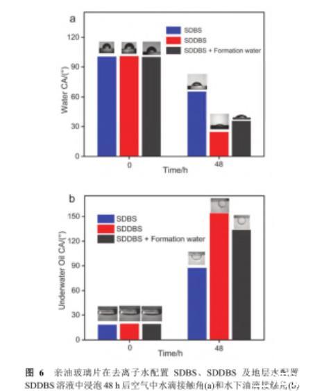 親油處理后玻璃片的空氣中水滴接觸角為100.2°,水下油滴接觸角為19.2°,為疏水親油性質(zhì).將親油玻璃片分別浸泡在0.02%(w)去離子水配置的SDBS、SDDBS溶液和地層水配置的SDDBS溶液中48 h,使用接觸角測(cè)量?jī)x分別測(cè)量不同處理時(shí)間下其水滴接觸角及水下油滴接觸角.結(jié)果如圖6所示.SDDBS潤(rùn)濕性調(diào)控能力較SDBS有較大提升,處理后空氣中水滴接觸角由65.1°降至24.5°,水下油滴接觸角由87.3°升至153.9°.經(jīng)SDDBS處理后的玻璃片呈現(xiàn)親水/水下強(qiáng)疏油性質(zhì).為探究鹽對(duì)界面潤(rùn)濕調(diào)控性能的影響,使用地層水配置的SDDBS溶液處理親油玻璃片,結(jié)果表明處理后空氣中水滴接觸角為35.6°,水下油滴接觸角為133.6°,說明地層水的引入降低了SDDBS對(duì)親油表面的親水疏油調(diào)控效果.這是由于地層礦化度條件下,SDDBS分子鏈團(tuán)聚影響界面吸附,導(dǎo)致潤(rùn)濕調(diào)控能力略有下降.