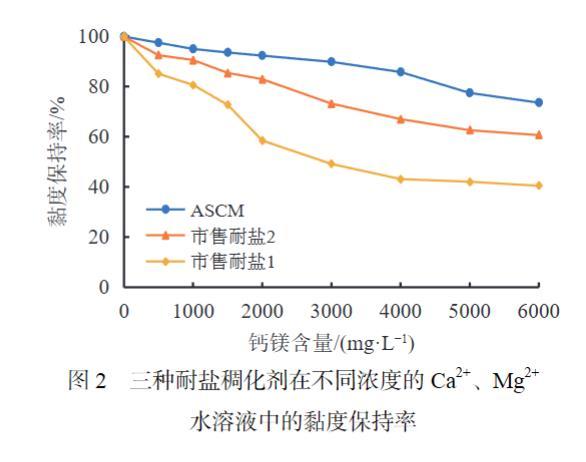 模擬蘇里格氣田水中Ca2+、Mg2+含量,配制鈣鎂總量在500~6000 mg/L的二價鹽水溶液,分別評價ASCM和兩種市售耐鹽稠化劑的耐鈣鎂離子的能力,結(jié)果如圖2所示。ASCM耐鈣鎂離子的能力明顯優(yōu)于另外兩種耐鹽稠化劑,當鈣鎂總量達到3000 mg/L時黏度保持率在90%左右,鈣鎂總量達到6000 mg/L時黏度保持率在70%以上,耐鈣鎂能力達到6000 mg/L。這是由于ASCM結(jié)構中的雙尾疏水單體在微疏水作用下賦予聚合物分子鏈良好的延展性和柔韌性,促使聚合物在高鹽水中快速舒展溶脹,同時含有的季銨鹽陽離子、磺酸基團能夠有效減弱高濃度Ca2+、Mg2+對聚合物的屏蔽作用,有利于形成更多的氫鍵結(jié)構,在分子鏈間提供更多的物理“交聯(lián)位點”,保持較大的流體力學體積,提高在鹽水中的增黏效果。
