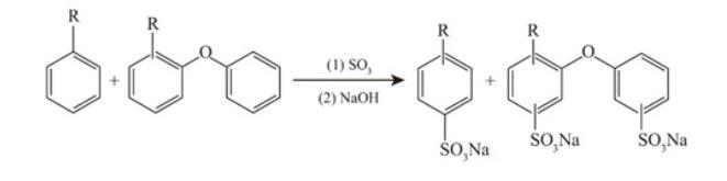 采用SO3膜式磺化工藝,改變烷基二苯醚與烷基苯的質(zhì)量比,將二者混合進行磺化反應,然后用NaOH溶液中和,制得質(zhì)量分數(shù)為25%的烷基二苯醚/烷基苯混合磺酸鹽,反應方程式如下: